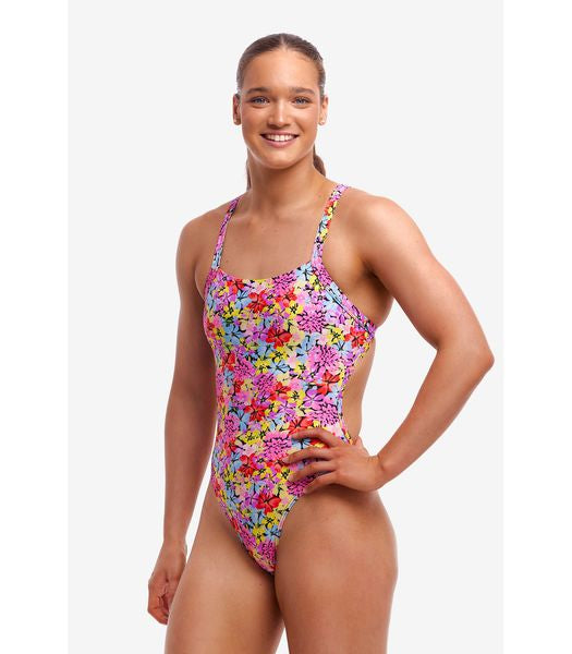 Der Brace Free Damen Badeanzug von Funkita ist vorne hoch und sportlich geschnitten. Aber hinten hat er einen tiefen Ausschnitt und ein dezentes Trägersystem, für alle Frauen die beides beim Schwimmen wollen, stylisch und sportlich! Damit du dich frei im Wasser bewegen kannst, sind die Beinausschnitte extra hoch. Der komplette Frontbereich ist von Innen mit Mesh gefüttert, damit auch nichts durchblitzen kann.